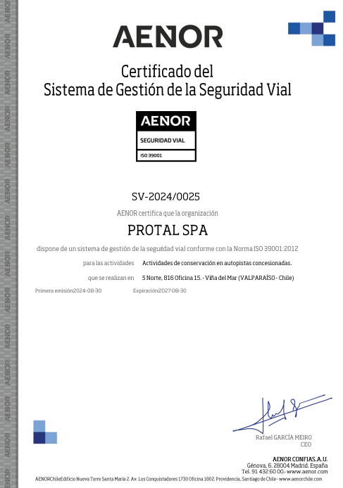 En Protal SPA contamos con la certificación ISO 39001:2012, otorgada por AENOR, que respalda nuestro compromiso con la seguridad vial y la excelencia operacional. Esta certificación avala que implementamos un sistema de gestión de la seguridad vial eficiente y alineado con los más altos estándares internacionales, asegurando la correcta ejecución de nuestras actividades de conservación en autopistas concesionadas.